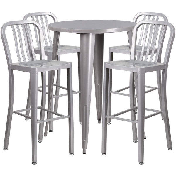 Complete your dining room, restaurant or patio with this chic bar table and chair set. This colorful set will add a retro-modern look to your home or eatery. Table features a smooth top and protective rubber floor glides. The industrial style barstool features an attractive vertical slat back. This 5 piece table set is designed for indoor and outdoor settings. For longevity, care should be taken to protect from long periods of wet weather. The possibilities are endless with the multitude of environments in which you can use this table, for both commercial and residential spaces.