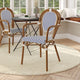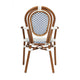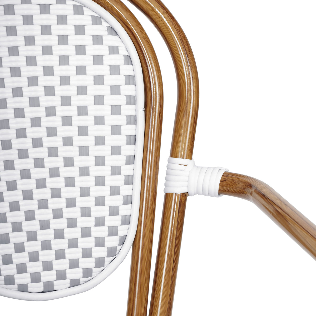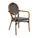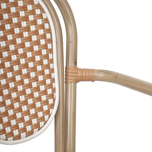 Bring the street vibes of Paris right into your restaurant, bistro, hotel, or backyard patio with this indoor/outdoor commercial grade bistro chair. The durable PE rattan Thonet-style back and seat are very comfortable and won't fade when used outdoors. The lightweight, but sturdy, powder coated metal frame boasts a black finish, holds up to 400 lbs. static weight, and will not rust. Recommended stack height for this chair is up to 5 high for storage or transport. Two curved arms deliver additional comfort and structure. For your convenience, this chair arrives completely assembled for instant use and features floor protector glides to prevent damage to indoor hard flooring surfaces. This dining chair easily wipes clean with a damp cloth for quick seating turnaround.