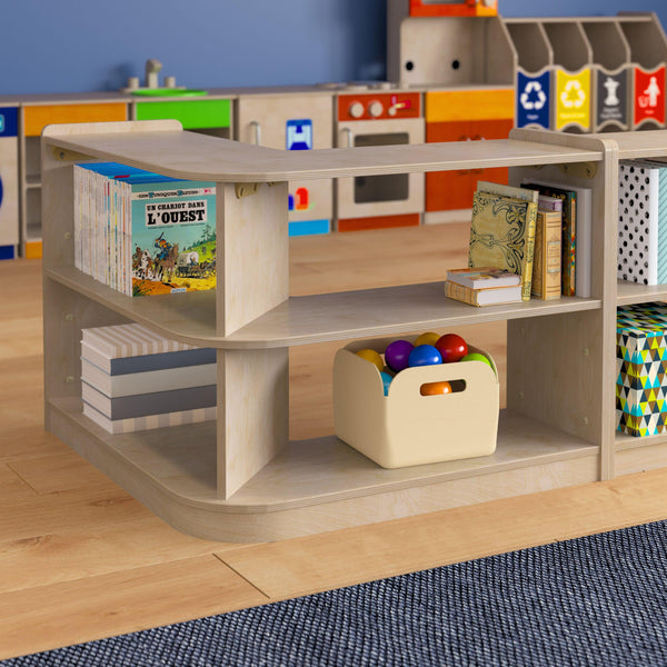 Organization is a must in today's classrooms but keeping things in order can be a struggle. This 2 tier wooden corner storage unit is beautifully designed with a glossy natural finish, rounded front edges, and lots of space for holding blocks, books, toys, or art supplies. Assigning cleanup tasks is a great method to facilitate independence and teach children to be helpful as well as organized.