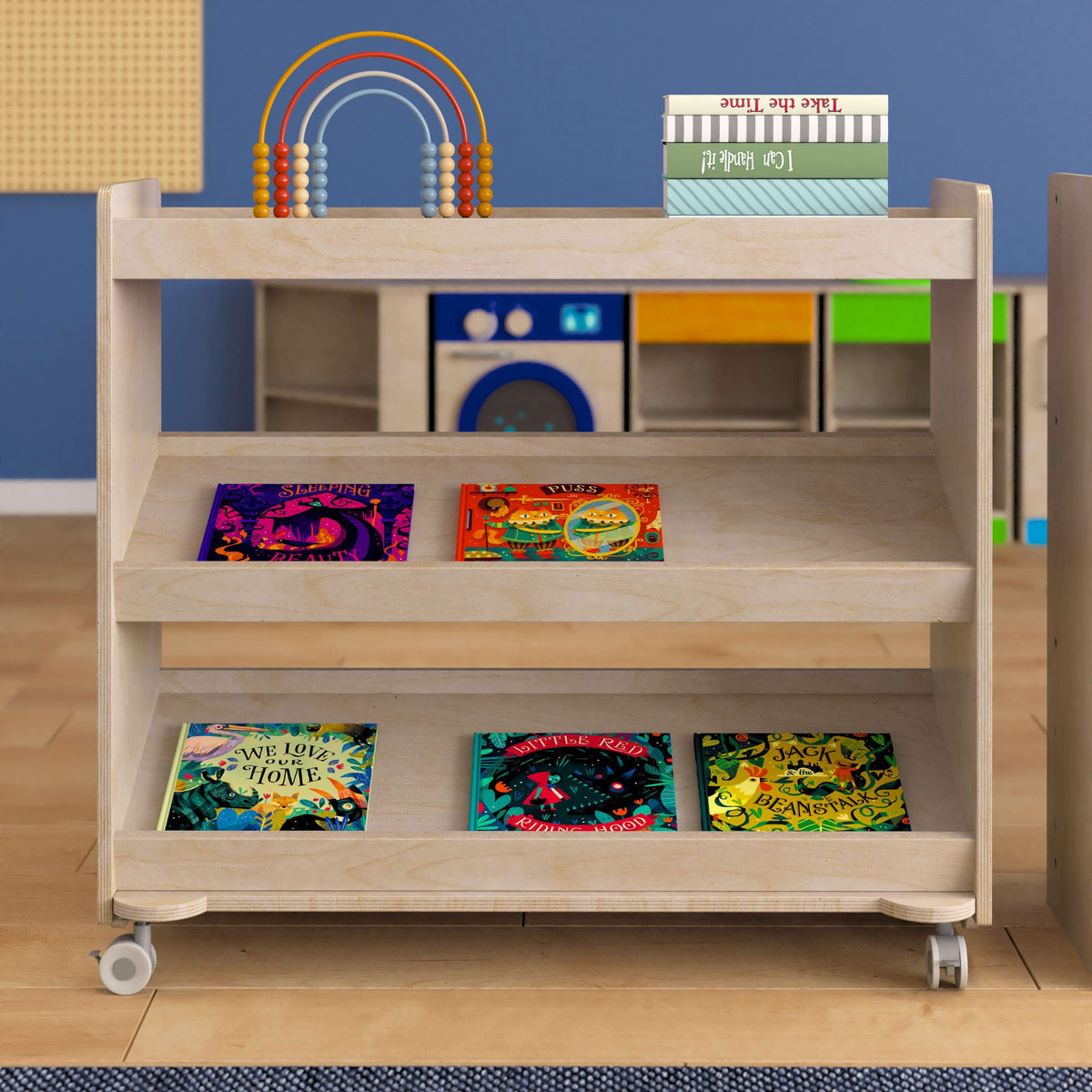 Organization is a must in today's classrooms but keeping things in order can be a struggle. This mobile wooden storage cart lets you bring necessary supplies to your current work area and the wheels lock in place for security. When you're finished with your project, the cart can be wheeled away to open up floor space for story time or free play. Beautifully designed with a glossy natural finish and boasting lots of space for holding blocks, books, toys, or art supplies, this classroom cart is a must-have for busy environments.
